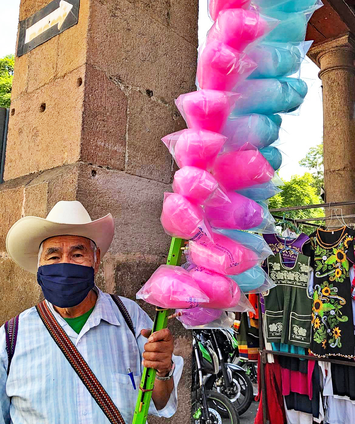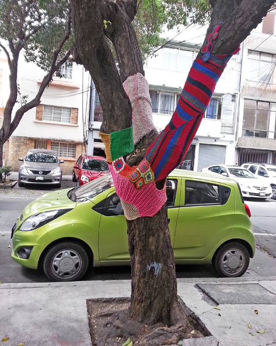 Just around the corner from Mexico Cooks!' former Mexico City headquarters, this tree wears a multi-colored and textured knit jacket.