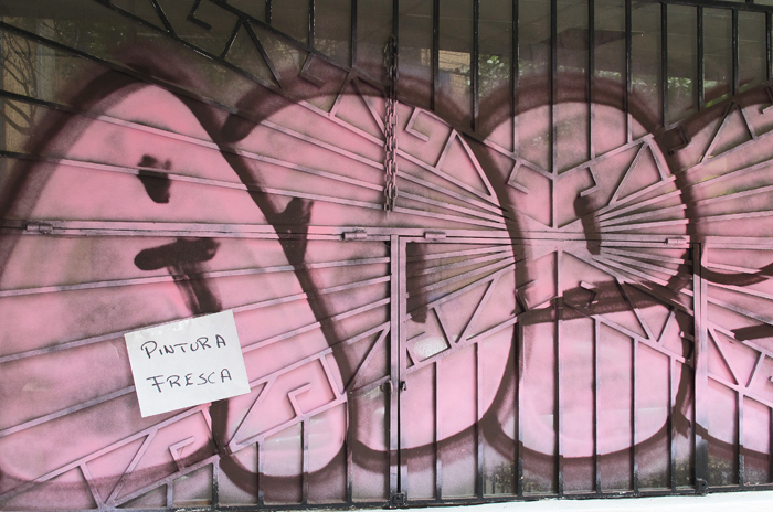 Pink graffiti on a window.  The little sign reads, "Fresh paint".  Click on any image to make it bigger, for a better view.
