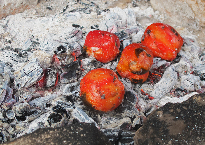 Tomatoes for salsa, roasting directly on the red-hot embers.  Private home, Teotitlán del Valle, Oaxaca.  "Sí, siempre los asamos así.  Agarran más sabor." ('Yes, we always roast them this way.  They take on more flavor.')