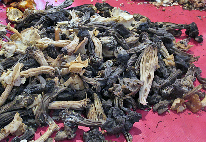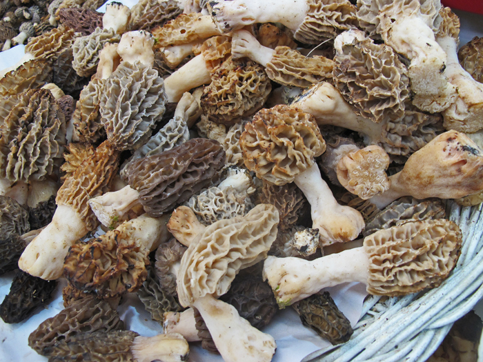 Fresh morel mushrooms, Mercado de San Juan, Mexico City.  Morels are available at this market fresh during the rainy season, and dried all year long.