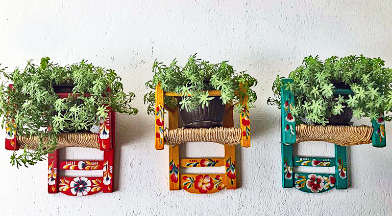 These miniature chairs–about the size to seat a one-year-old baby–were all but viral on Facebook when I uploaded the photo.  Turned upside down with potted plants on the bottoms of the straw seats, the chairs make a charming entrance into my home.
