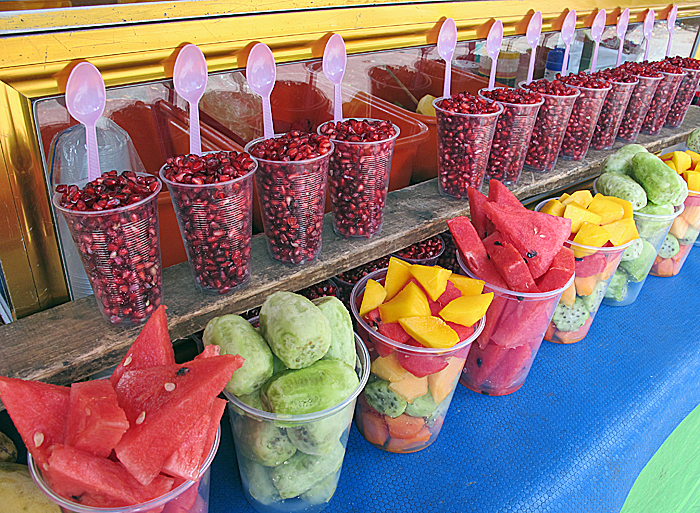 We who live in Mexico are fortunate to find pomegranate seeds ready to use, sold in plastic cups.  Can you see them at the top of the photo, with the pink plastic spoons stuck into the cups?