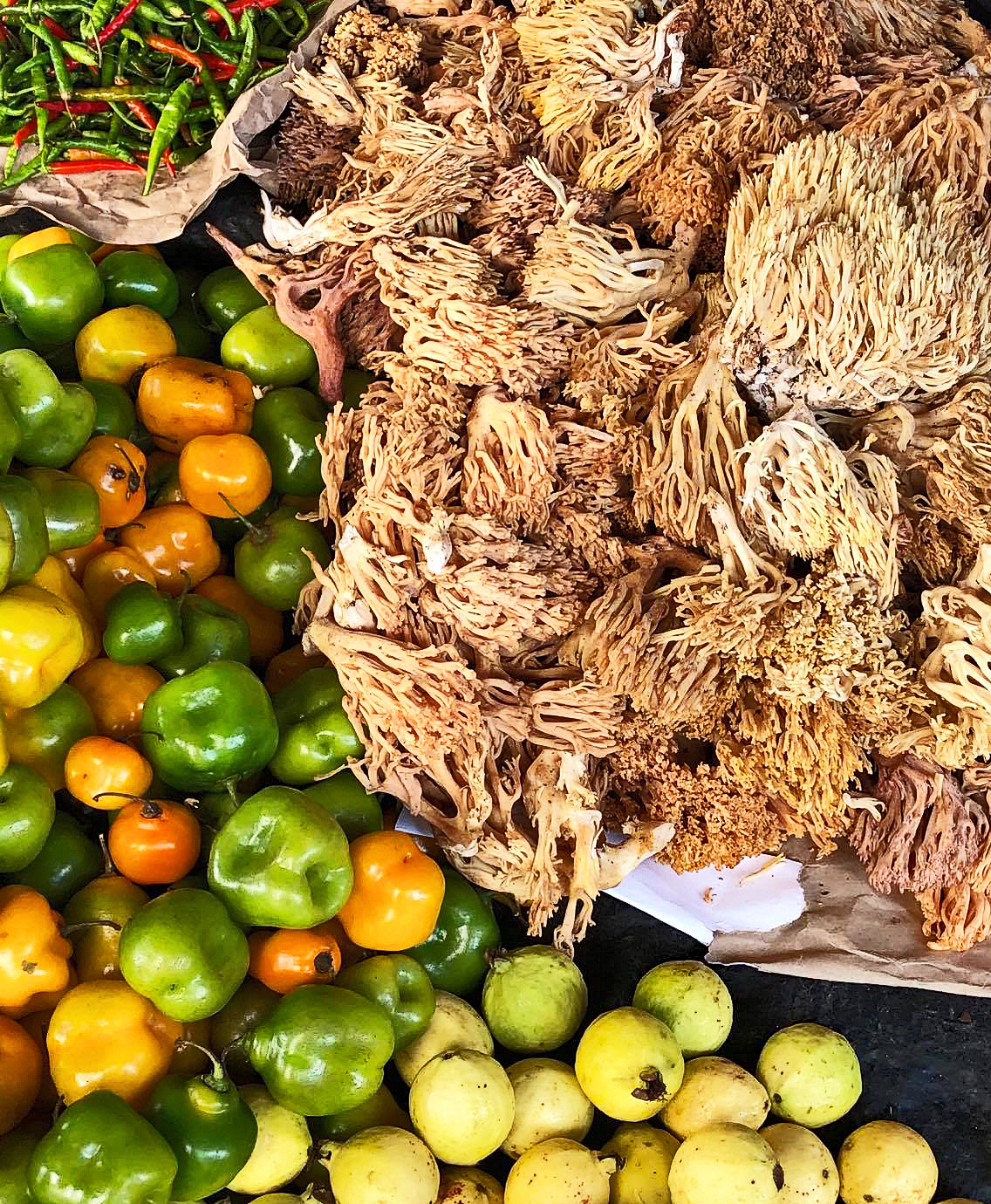 Huitlacoche (corn fungus) is one of Mexico's true delicacies.  This foot-high pile of the fungus has been removed from the fresh corn cob, but it's also available on the cob.