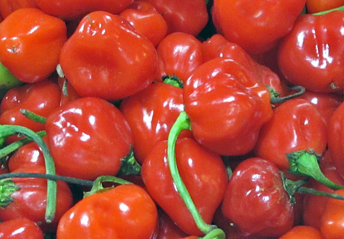 Up-close-and-personal with super-spicy Red Savina chiles habaneros, which have a rating of 580,000+ on the Scoville Scale.  Bite into one at your own risk!  This variety is just an example of the many kinds of chiles available at La Merced.