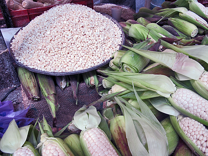 Here in Mexico, it's the season for fresh corn.  This booth–and the next one, and the one after that, and the one around the corner, too–offer corn either as elotes (fresh and tender, on the cob) or already desgranado (taken off the cob).  The fresh corn kernels in the bowl weighed about 25 pounds.