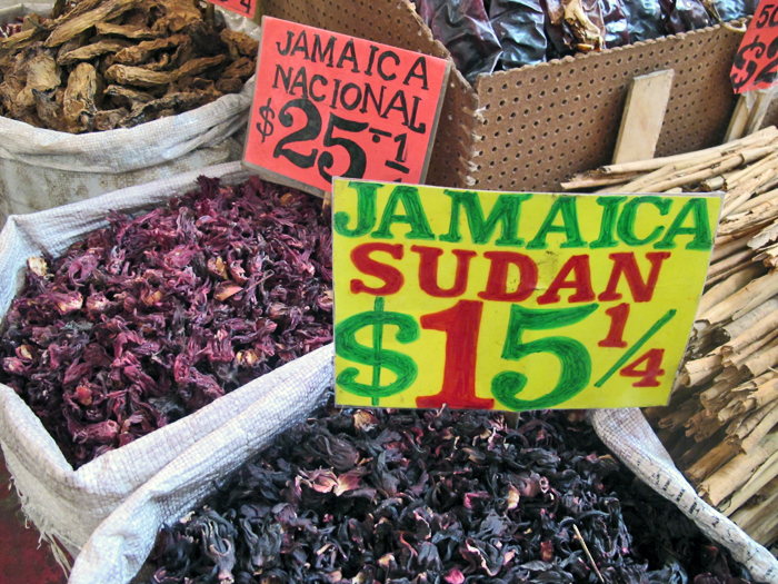 On the left, dried jamaica blossoms (a kind of hibiscus) grown in Mexico.  On the right, jamaica imported from the Sudan.  The prices are per quarter kilo (about one-half pound).  The unfortunate reality is that the higher-quality Mexican blossoms are more expensive than the imported version.  Most people prefer to buy Mexican-grown products, but price can be a deterrent.  These flowers are used primarily to prepare agua de jamaica, a refreshing cold drink enjoyed copiously all over the República.
