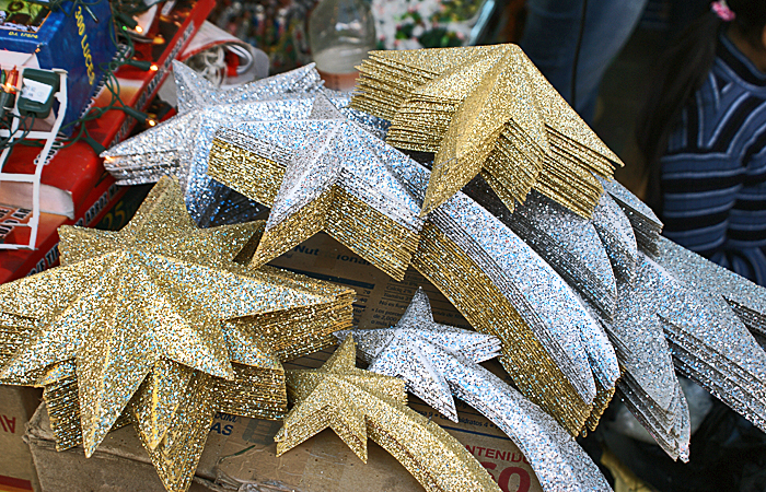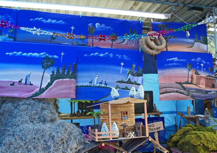 The street and the bridge to the Basílica are filled chock-a-block with booths selling souvenirs of La Villa. Everything that you can think of (and plenty you would never think of) is available: piles of T-shirts with the image of the Virgin of Guadalupe and that of Juan Diego, CDs of songs devoted to her, bandanna-like scarves with her portrait, eerie green glow-in-the-dark figurines of her, key chains shaped like the Basílica, statues of La Virgencita in every size and quality, holy water containers that look like her in pink, blue, silver, and pearly white plastic, religious-theme jewelry and rosaries that smell of rose petals, snow globes with tiny statues of La Guadalupana and the kneeling Juan Diego that are dusted with stars when the globes are shaken.