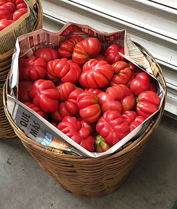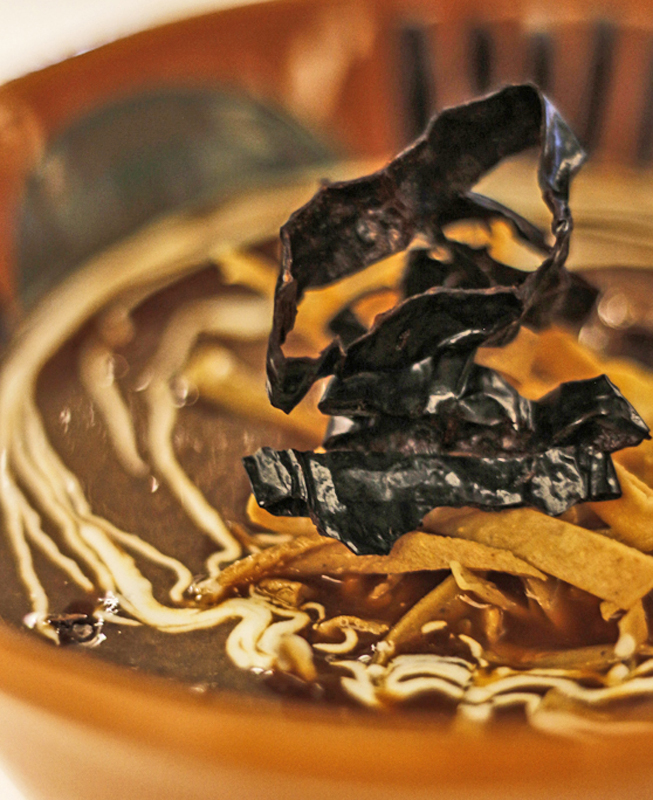 Roast the tomatoes, onions, and remaining five cloves of garlic on the comal, then blend them until they make a very smooth sauce. If necessary for blending, add just a little of the reserved meat cooking liquid. Using the wire mesh strainer, strain and reserve.